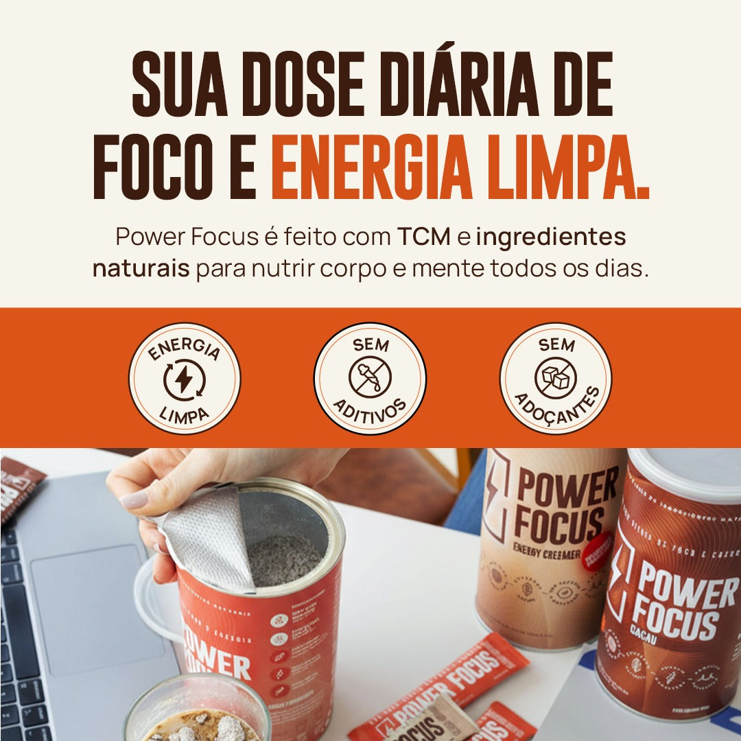 O Power Focus é um superfood 100% natural e vegano que ajuda a aumentar sua energia e performance mental de maneira rápida, prática e saudável. Feito com gorduras de excelente qualidade extraídas do coco, que são rapidamente absorvidas pelo cérebro, combinadas com outros ingredientes, como café e cacau, o Power Focus reúne sabor, disposição, saciedade e nutrição eficiente para corpo r mente. O Power Focus é um produto de rótulo limpo, ou seja, sem aditivos, conservantes. É um ótimo aliado para fornecer foco e energia antes dos treinos, do trabalho, dos estudos ou simplesmente para passar o dia bem.